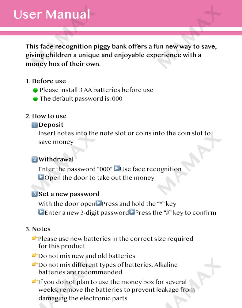 ✅Designed with simulated face recognition, password unlock, automatic note intake, coin slot, and lights & music, this cute money box gives children a fun and interactive saving experience