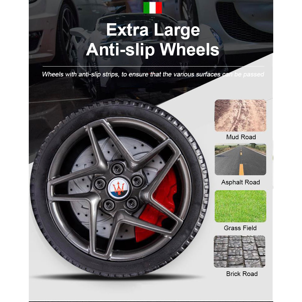 Extra large anti-slip wheels, all wheels with anti-slip strips, to ensure that the various surfaces can be passed. For examples: mud road, asphalt road, grass field, brick road and so on..