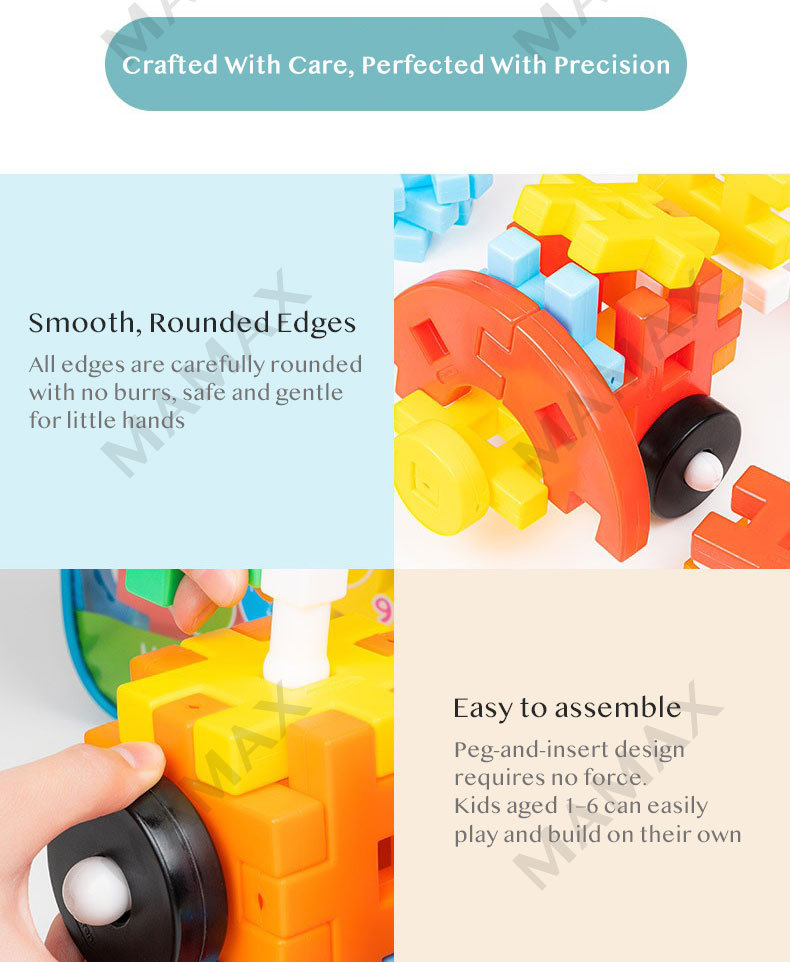 • Easy to assemble. Peg-and-insert design requires no force. Kids aged 1-6 can easily play and build on their own