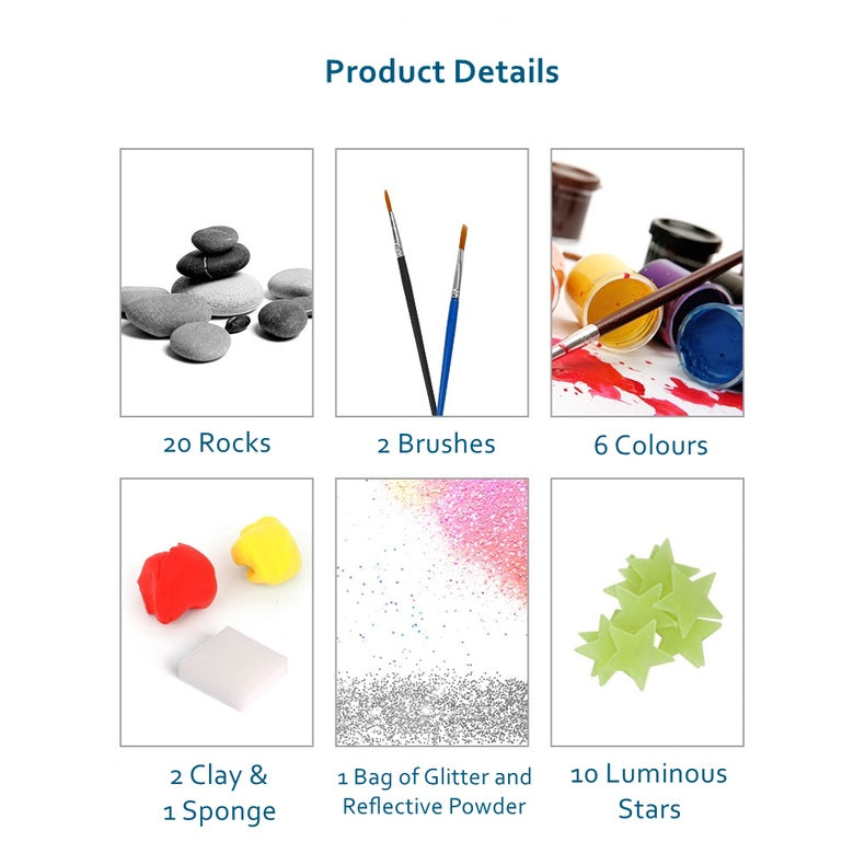 ★内容:一袋石头,2 把刷子,6 种颜色,1 块海绵,1 袋闪光粉,10 颗星星,2 袋粘土,1 袋银色闪光粉和 1 本说明书