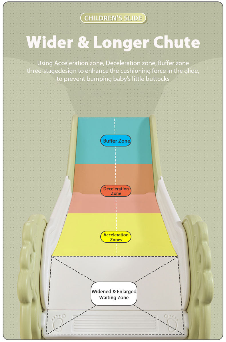 ★Wider & longer chute, using acceleration zone, deceleration zone, buffer zone three-stage design to enhance the cushioning force in the glide, to prevent bumping baby's little buttocks