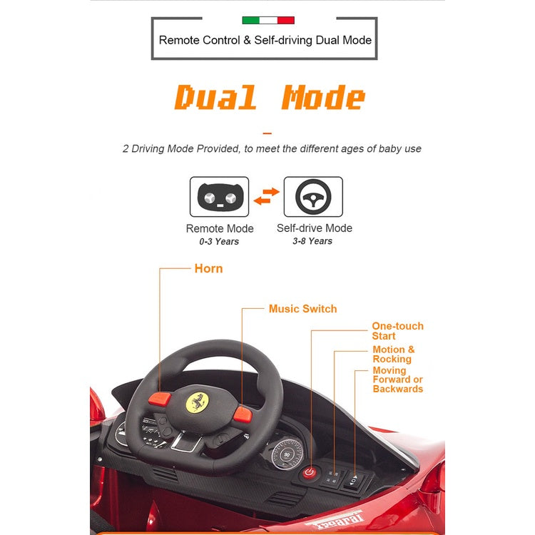 2.4G蓝牙遥控+自动驾驶+轻松拖曳+早教音乐+双重减震系统+一键启动+AUX/TF/USB+LED灯+快拆座椅+摇摆模式+五点式安全带+双门设计