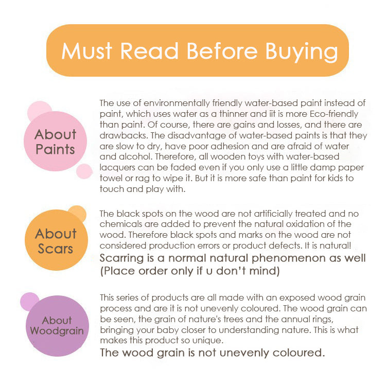 使用环保的水性漆代替油漆,水性漆以水作为稀释剂,比油漆更环保。当然有得有失,也有弊端。水性漆的缺点是干得慢,附着力差,怕水和酒精。所以,所有涂有水性漆的木制玩具,即使你只用一点湿纸巾或抹布擦拭,也会褪色。但对于孩子来说,它比油漆更安全,可以触摸和玩耍。