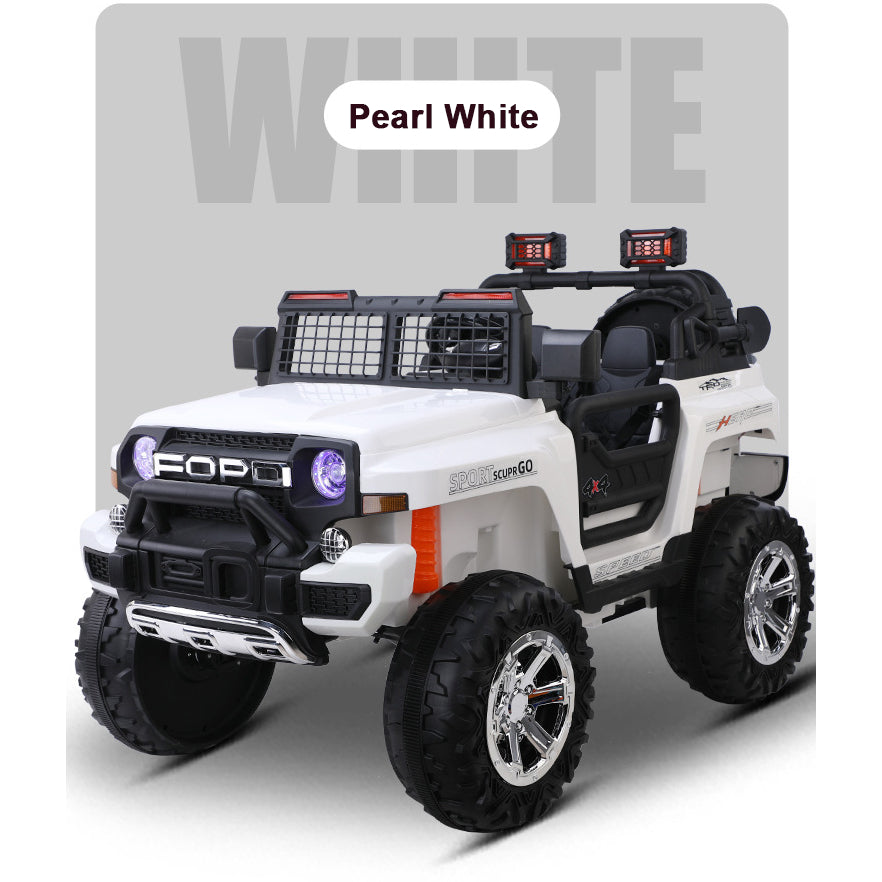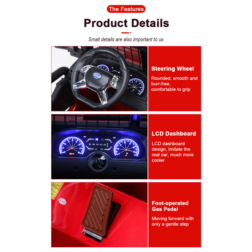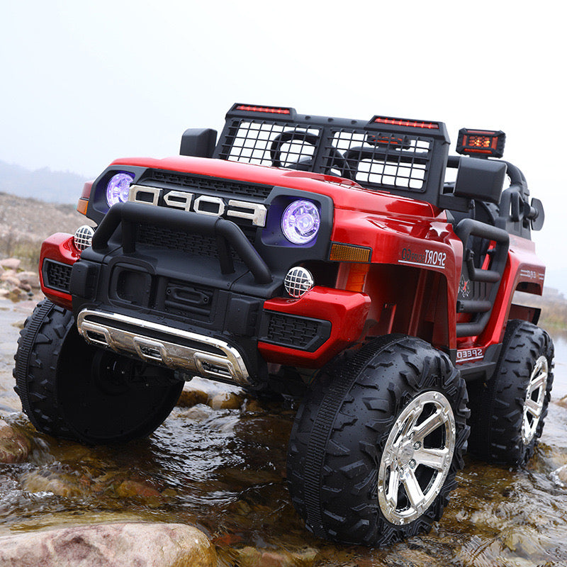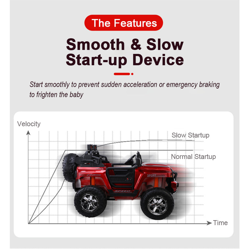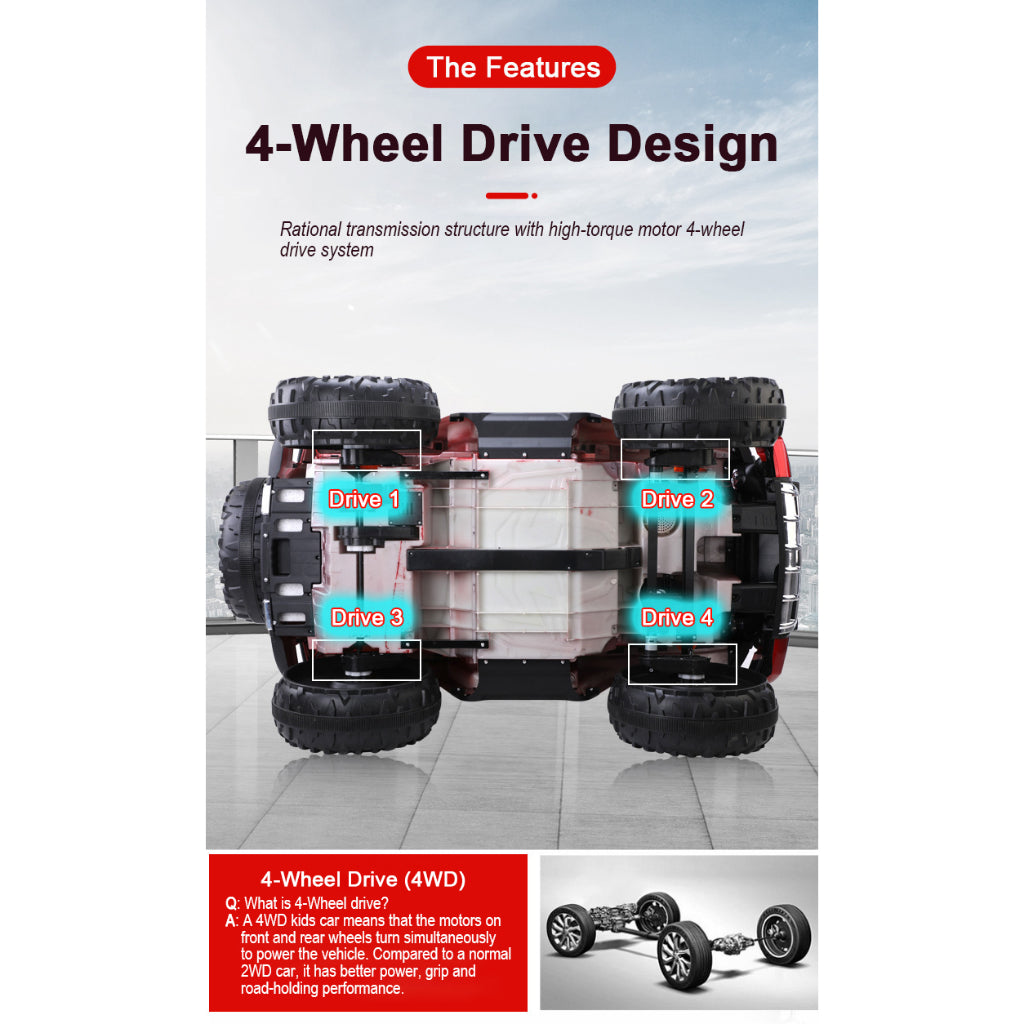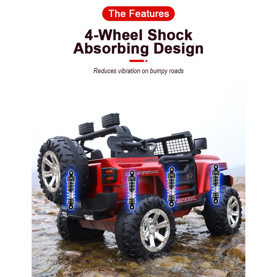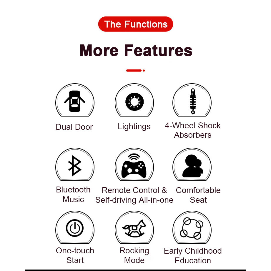 ★酷炫双门设计,LED 照明,四轮减震器,蓝牙音乐,3 种操作模式:遥控 + 自动驾驶一体式,舒适真皮座椅,一键启动,摇摆模式,幼儿教育功能,液晶仪表盘,大容量后斗